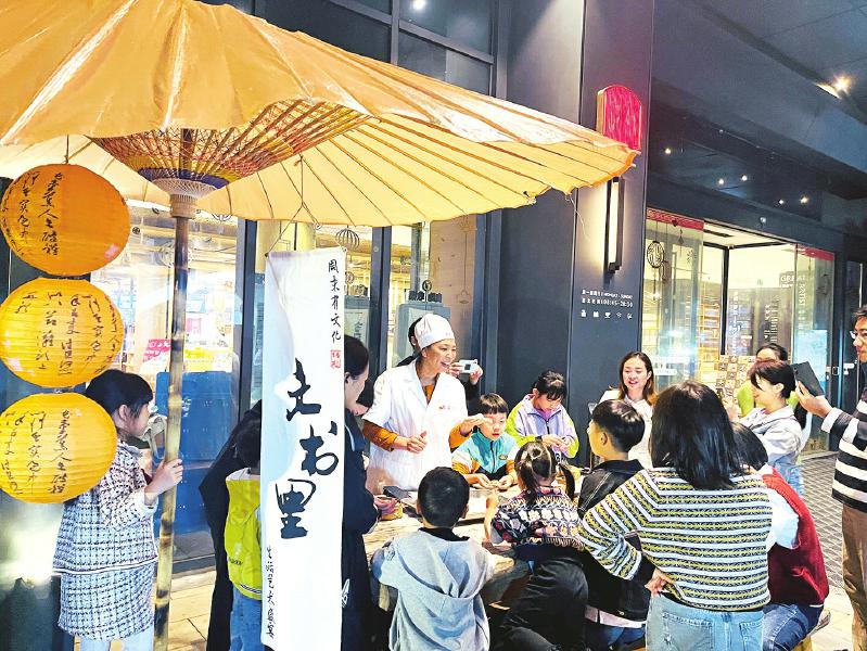 嵊州非遺美食小籠包傳承人沈紅平在嵊州書城“文書里”文化市集上帶小朋友制作品嘗小籠包。
